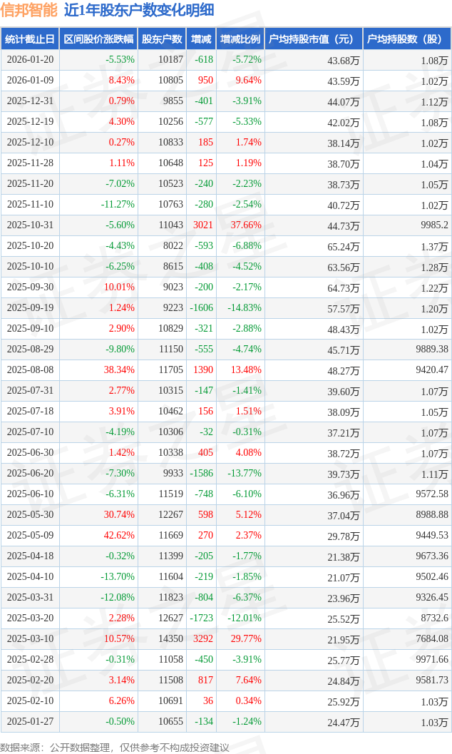 从股价来看,2026年1月9日至2026年1月20日,信邦智能区间跌幅为5.53%,在此期间股东户数减少618.0户,减幅为5.72%。