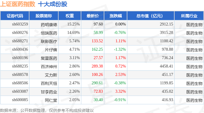 证券之星消息,1月23日,上证医药(000037)指数报收于6570.67点,涨1.02%,成交268.6亿元,换手率1.56%。当日该指数成份股中,上涨的有43家,益丰药房以10.02%的涨幅领涨,下跌的有5家,片仔癀以1.32%的跌幅领跌。
