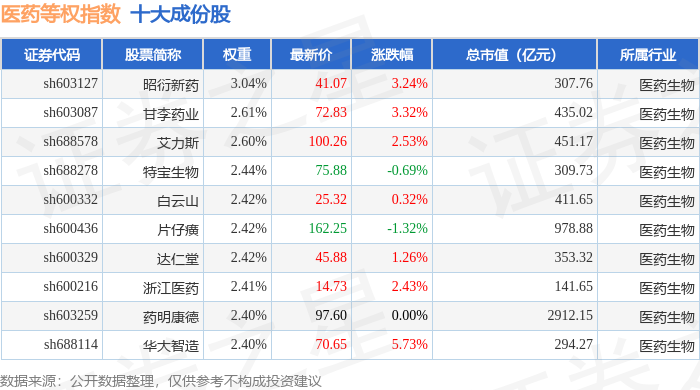证券之星消息,1月23日,医药等权(000075)指数报收于7208.17点,涨1.65%,成交268.6亿元,换手率1.56%。当日该指数成份股中,上涨的有43家,益丰药房以10.02%的涨幅领涨,下跌的有5家,片仔癀以1.32%的跌幅领跌。