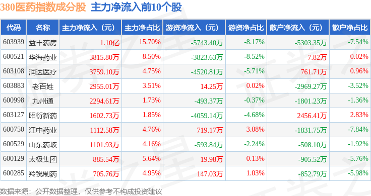 资金流向方面,380医药(000109)指数成份股当日主力资金净流入合计5396.02万元,游资资金净流出合计2.48亿元,散户资金净流入合计1.94亿元。成份股资金流向详情见下表:
