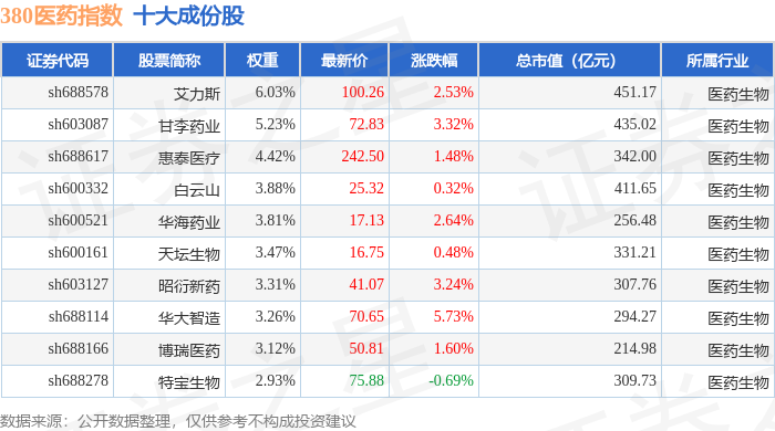 380医药(000109)指数十大成份股详情如下: