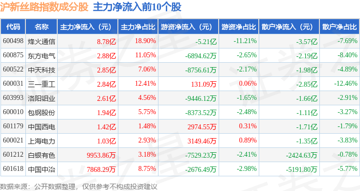 资金流向方面,沪新丝路(000160)指数成份股当日主力资金净流出合计53.79亿元,游资资金净流入合计21.85亿元,散户资金净流入合计31.94亿元。成份股资金流向详情见下表: