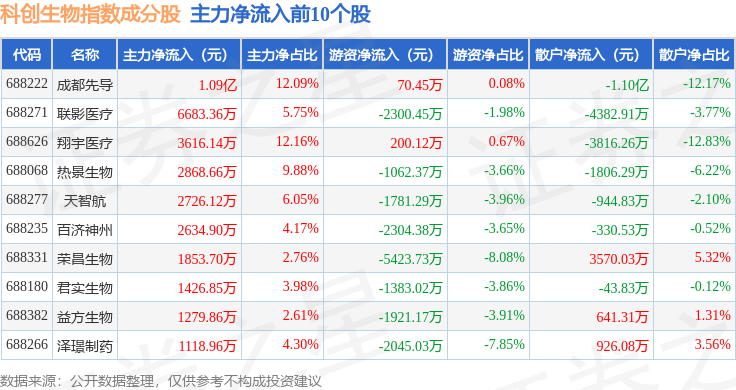 资金流向方面,科创生物(000683)指数成份股当日主力资金净流入合计2.13亿元,游资资金净流出合计3.05亿元,散户资金净流入合计9222.29万元。成份股资金流向详情见下表: