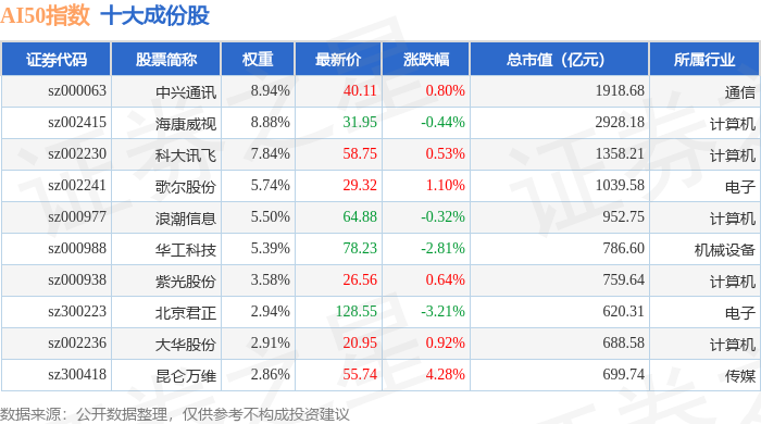AI50(399284)指数十大成份股详情如下: