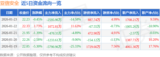 证券之星消息,截至2026年1月23日收盘,亚信安全(688225)报收于22.23元,下跌0.45%,换手率2.02%,成交量8.08万手,成交额1.78亿元。