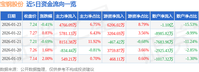 证券之星消息,截至2026年1月23日收盘,宝钢股份(600019)报收于7.24元,下跌0.41%,换手率0.45%,成交量97.51万手,成交额7.06亿元。