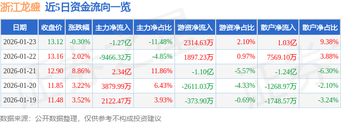 1月23日的资金流向数据方面,主力资金净流出1.27亿元,占总成交额11.48%,游资资金净流入2314.63万元,占总成交额2.1%,散户资金净流入1.03亿元,占总成交额9.38%。