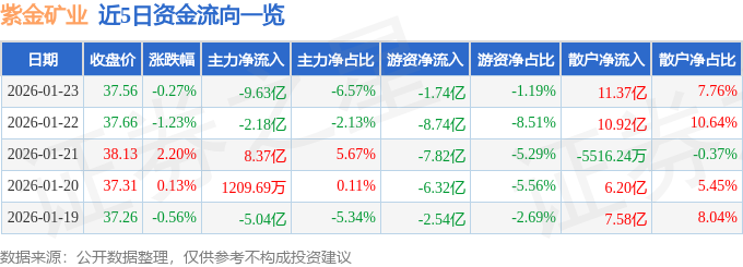 证券之星消息,截至2026年1月23日收盘,紫金矿业(601899)报收于37.56元,下跌0.27%,换手率1.88%,成交量386.3万手,成交额146.51亿元。