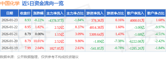 证券之星消息,截至2026年1月23日收盘,中国化学(601117)报收于8.93元,下跌0.22%,换手率4.36%,成交量265.62万手,成交额23.8亿元。