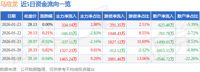 证券之星消息,截至2026年1月23日收盘,马应龙(600993)报收于28.13元,上涨0.0%,换手率0.96%,成交量4.13万手,成交额1.16亿元。