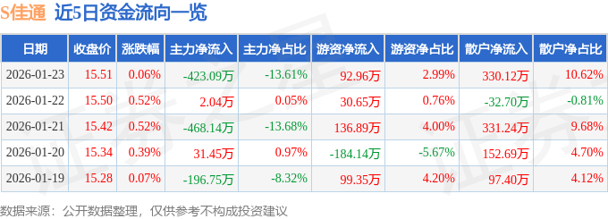证券之星消息,截至2026年1月23日收盘,S佳通(600182)报收于15.51元,上涨0.06%,换手率1.18%,成交量2.01万手,成交额3108.99万元。