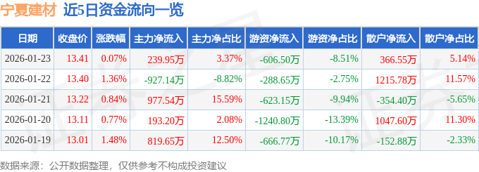 证券之星消息,截至2026年1月23日收盘,宁夏建材(600449)报收于13.41元,上涨0.07%,换手率1.11%,成交量5.32万手,成交额7126.28万元。