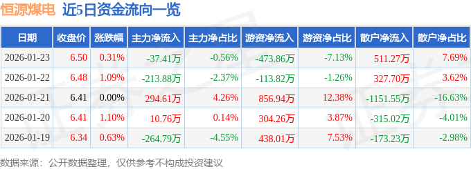 证券之星消息,截至2026年1月23日收盘,恒源煤电(600971)报收于6.5元,上涨0.31%,换手率0.85%,成交量10.25万手,成交额6646.84万元。