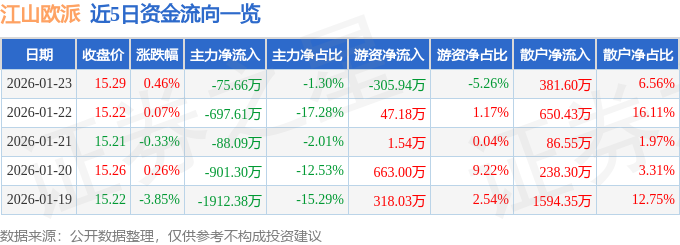 证券之星消息,截至2026年1月23日收盘,江山欧派(603208)报收于15.29元,上涨0.46%,换手率2.15%,成交量3.81万手,成交额5814.48万元。