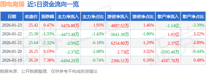 证券之星消息,截至2026年1月23日收盘,国电南瑞(600406)报收于25.42元,上涨0.47%,换手率1.65%,成交量131.94万手,成交额33.56亿元。