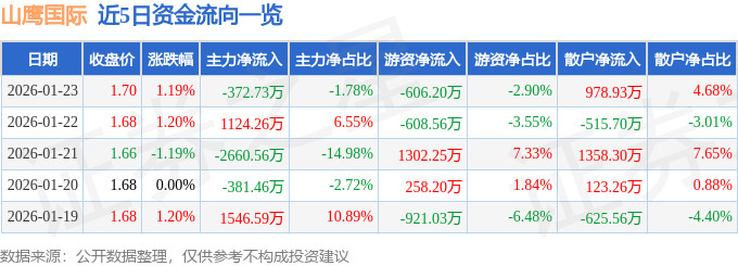 证券之星消息,截至2026年1月23日收盘,山鹰国际(600567)报收于1.7元,上涨1.19%,换手率1.97%,成交量124.04万手,成交额2.09亿元。