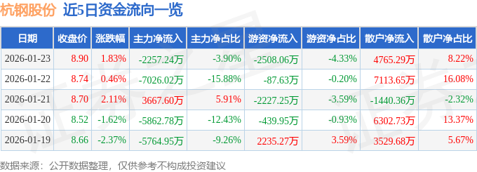 证券之星消息,截至2026年1月23日收盘,杭钢股份(600126)报收于8.9元,上涨1.83%,换手率1.94%,成交量65.44万手,成交额5.79亿元。