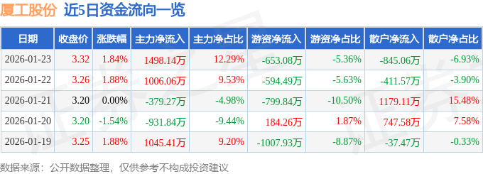 证券之星消息,截至2026年1月23日收盘,厦工股份(600815)报收于3.32元,上涨1.84%,换手率2.09%,成交量37.05万手,成交额1.22亿元。