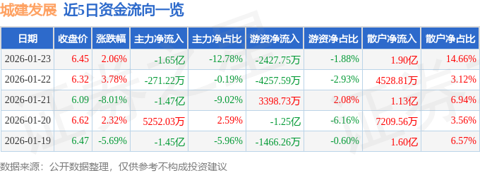 证券之星消息,截至2026年1月23日收盘,城建发展(600266)报收于6.45元,上涨2.06%,换手率9.66%,成交量200.55万手,成交额12.93亿元。
