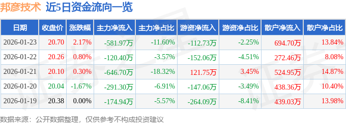 证券之星消息,截至2026年1月23日收盘,邦彦技术(688132)报收于20.7元,上涨2.17%,换手率2.25%,成交量2.44万手,成交额5018.93万元。