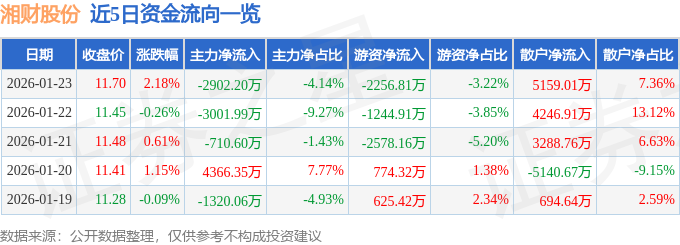 证券之星消息,截至2026年1月23日收盘,湘财股份(600095)报收于11.7元,上涨2.18%,换手率2.09%,成交量59.79万手,成交额7.01亿元。