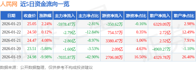 证券之星消息,截至2026年1月23日收盘,人民网(603000)报收于25.05元,上涨2.24%,换手率7.67%,成交量84.8万手,成交额21.26亿元。