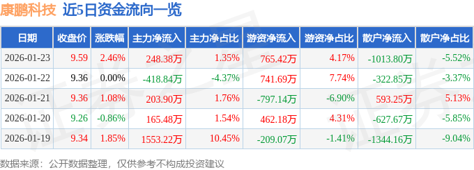 证券之星消息,截至2026年1月23日收盘,康鹏科技(688602)报收于9.59元,上涨2.46%,换手率7.45%,成交量19.35万手,成交额1.84亿元。