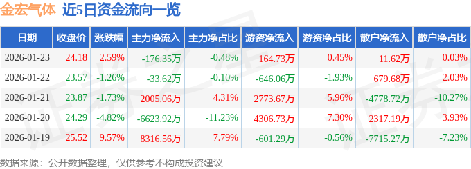 证券之星消息,截至2026年1月23日收盘,金宏气体(688106)报收于24.18元,上涨2.59%,换手率3.19%,成交量15.37万手,成交额3.68亿元。