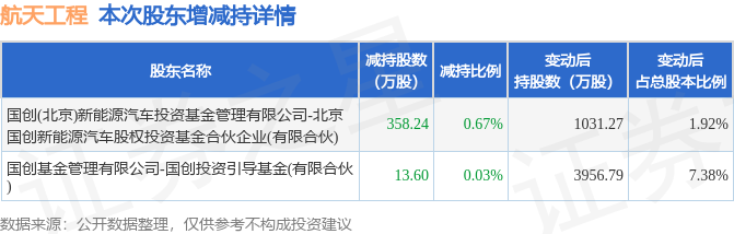 证券之星消息,1月23日航天工程发布公告《航天工程:航天工程公司关于股东减持股份结果的公告》,其股东国创基金管理有限公司-国创投资引导基金(有限合伙)、国创(北京)新能源汽车投资基金管理有限公司-北京国创新能源汽车股权投资基金合伙企业(有限合伙)于2025年12月25日至2026年1月23日间合计减持371.84万股,占公司目前总股本的0.6938%,变动期间该股股价上涨10.73%,截止1月23日收盘报37.67元。