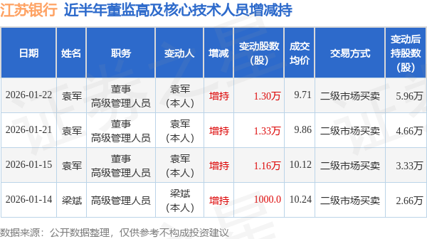 证券之星消息,根据1月23日市场公开信息、上市公司公告及交易所披露数据整理,江苏银行(600919)最新董监高及相关人员股份变动情况:2026年1月22日公司董事,高级管理人员袁军共增持公司股份1.3万股,占公司总股本为0.0001%。变动期间公司股价上涨1.13%,1月22日当日收盘报9.84元。
