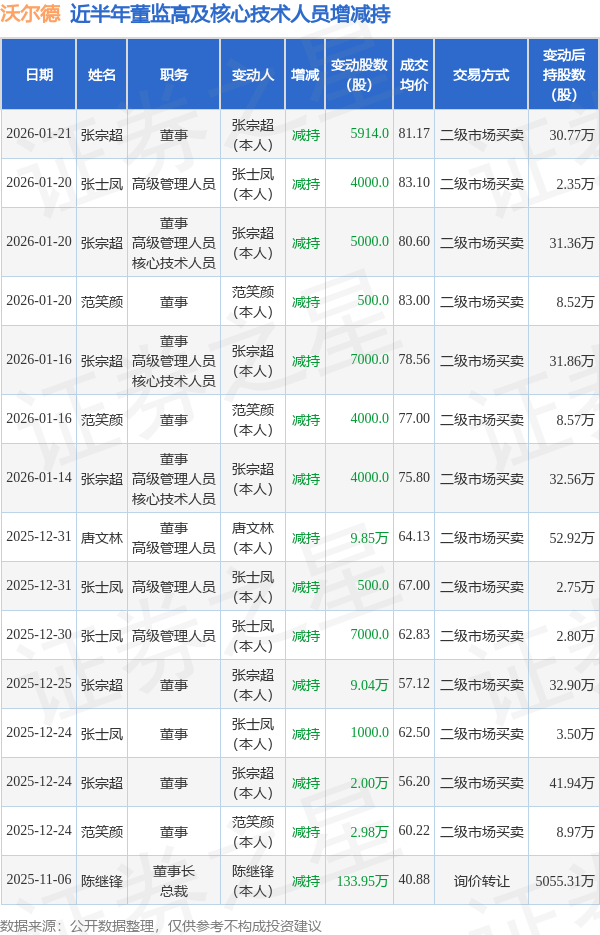 沃尔德近半年内的董监高及核心技术人员增减持详情如下: