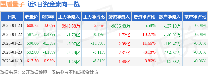 证券之星消息,截至2026年1月23日收盘,国盾量子(688027)报收于608.72元,上涨3.6%,换手率3.66%,成交量2.94万手,成交额17.57亿元。