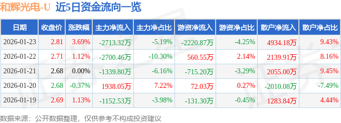 1月23日的资金流向数据方面,主力资金净流出2713.32万元,占总成交额5.19%,游资资金净流出2220.87万元,占总成交额4.25%,散户资金净流入4934.18万元,占总成交额9.43%。