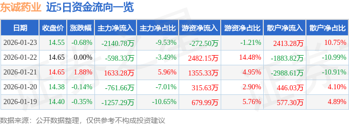 证券之星消息,截至2026年1月23日收盘,东诚药业(002675)报收于14.55元,下跌0.68%,换手率2.07%,成交量15.36万手,成交额2.25亿元。