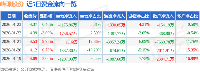 证券之星消息,截至2026年1月23日收盘,峰璟股份(002662)报收于4.37元,下跌0.46%,换手率4.72%,成交量70.75万手,成交额3.09亿元。