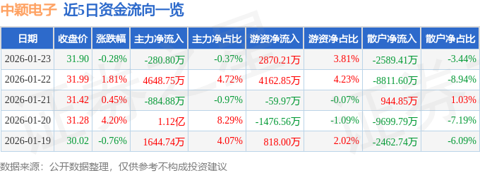 证券之星消息,截至2026年1月23日收盘,中颖电子(300327)报收于31.9元,下跌0.28%,换手率7.02%,成交量23.74万手,成交额7.53亿元。