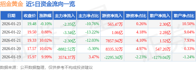 证券之星消息,截至2026年1月23日收盘,招金黄金(000506)报收于19.48元,下跌0.1%,换手率11.76%,成交量109.2万手,成交额21.86亿元。