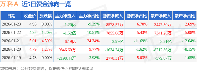证券之星消息,截至2026年1月23日收盘,万 科A(000002)报收于4.95元,上涨0.0%,换手率2.68%,成交量260.22万手,成交额12.81亿元。