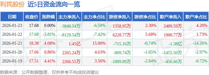 证券之星消息,截至2026年1月23日收盘,利民股份(002734)报收于17.68元,上涨0.0%,换手率7.74%,成交量33.64万手,成交额5.92亿元。