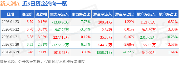 证券之星消息,截至2026年1月23日收盘,新大洲A(000571)报收于6.79元,上涨0.15%,换手率3.11%,成交量25.34万手,成交额1.72亿元。