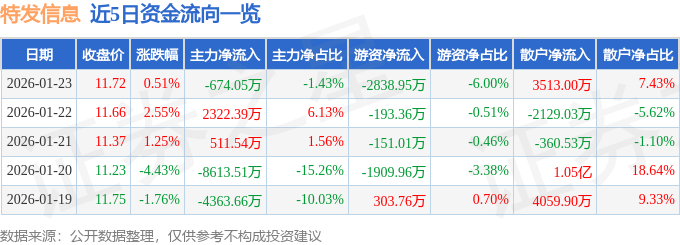 证券之星消息,截至2026年1月23日收盘,特发信息(000070)报收于11.72元,上涨0.51%,换手率4.57%,成交量40.65万手,成交额4.73亿元。