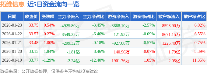 证券之星消息,截至2026年1月23日收盘,拓维信息(002261)报收于33.75元,上涨0.54%,换手率3.7%,成交量42.43万手,成交额14.28亿元。