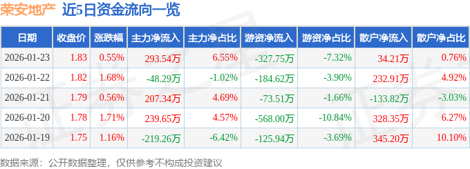 证券之星消息,截至2026年1月23日收盘,荣安地产(000517)报收于1.83元,上涨0.55%,换手率0.99%,成交量24.57万手,成交额4479.54万元。