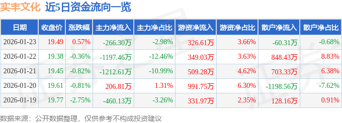 证券之星消息,截至2026年1月23日收盘,实丰文化(002862)报收于19.49元,上涨0.57%,换手率3.62%,成交量4.57万手,成交额8932.8万元。