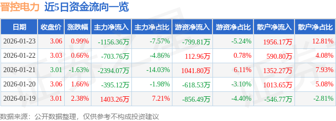 证券之星消息,截至2026年1月23日收盘,晋控电力(000767)报收于3.06元,上涨0.99%,换手率1.72%,成交量50.03万手,成交额1.53亿元。
