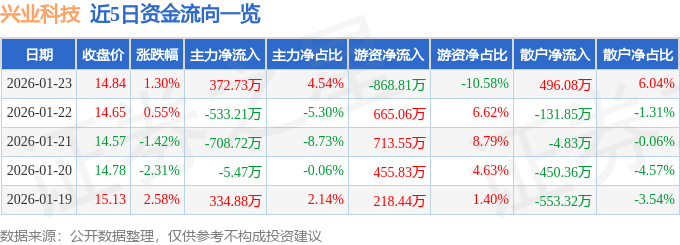 证券之星消息,截至2026年1月23日收盘,兴业科技(002674)报收于14.84元,上涨1.3%,换手率1.9%,成交量5.57万手,成交额8210.62万元。