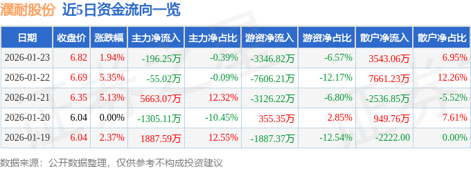 证券之星消息,截至2026年1月23日收盘,濮耐股份(002225)报收于6.82元,上涨1.94%,换手率7.62%,成交量74.26万手,成交额5.1亿元。