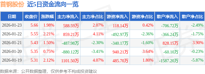 证券之星消息,截至2026年1月23日收盘,首钢股份(000959)报收于5.66元,上涨1.98%,换手率0.67%,成交量50.7万手,成交额2.84亿元。