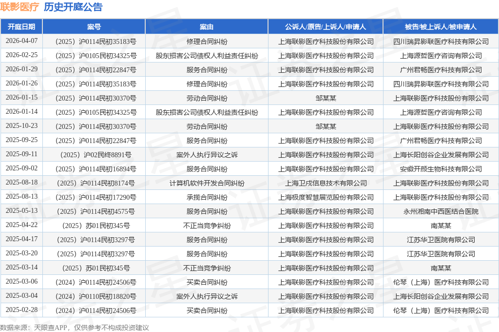 案号:(2025)沪0114民初35183号根据统计,近一年内以上海联影医疗科技股份有限公司为当事人的历史开庭公告有20则,其中案由为“服务合同纠纷”的公告以6则居首,其次为“不正当竞争纠纷”有2则,“买卖合同纠纷”有2则。历史开庭公告如下: