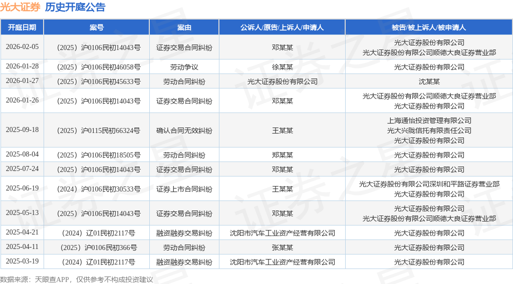 案号:(2025)沪0106民初14043号根据统计,近一年内以光大证券股份有限公司为当事人的历史开庭公告有12则,其中案由为“证券交易合同纠纷”的公告以4则居首,其次为“劳动合同纠纷”有3则,“融资融券交易纠纷”有2则。历史开庭公告如下: